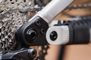 Instead of integrating the adjustment range into the dropout itself, the entire dropout is designed as the adjustment element. Interchangeable dropout inserts allow the chainstay length to be set 5 mm shorter or longer than the base setting. These parts bolt securely to the frame and can be swapped in just a few minutes. An additional pinch bolt secures the rear wheel axle, preventing loosening during hard cornering or frame flex.